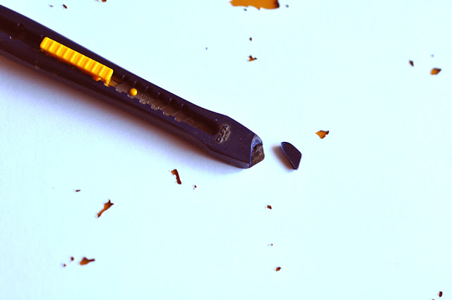 2012-11-03 PITS My weapon broke… いつも使っているカッターナイフの先がかけてしまった。 ステンシルカットをする人はだいたいアートナイフを使っているっぽいが、普通のカッターナイフの方が力が入りやすく、刃をよく折る僕には向いている。いろんなカッターナイフを試し、このカッターナイフは角がなく握りやすく気に入っていた。 かれこれ4~5年間、一筋で使っていた愛着あるカッターナイフなので残念だが、たくさんの作品を一緒に作りってきたこのカッターナイフに感謝。